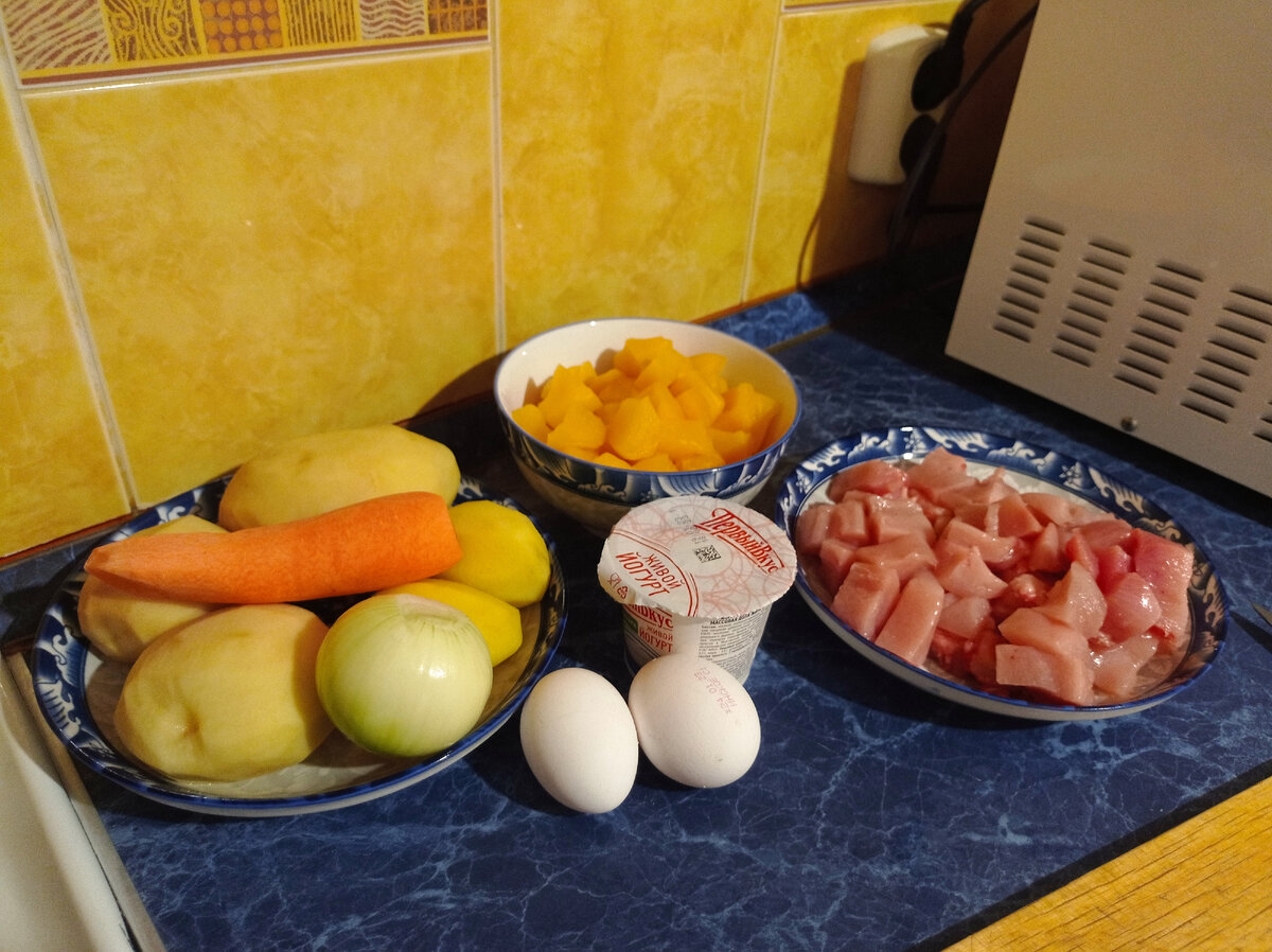 Всем доброго времени суток. Я к вам с очередным рецептом из тыквы. Тыквенная неделя продолжается) На этот раз решила приготовить не десерт, а основное блюдо. Многие ассоциируют тыкву со сладкими блюдами. На самом деле из нее можно готовить все что угодно. А какой изумительной получается запеканка из курицы (индейки), тыквы и других овощей! Это блюдо считается диетическим и невероятно полезным. С тыквой можно приготовить большое количество низкокалорийных мясных блюд. Видео-рецепт приготовления запеканки. Для запеканки нам понадобится: Приготовление до безобразия простое и предподготовка занимает от силы минут 20 времени. Картофель, морковь, лук, тыкву очистите и нарежьте кубиками. Мясо промойте, обсушите и также нарежьте кубиками любого размера. Смажьте форму для запекания маслом, выложите первым слоем мясо курицы или индейки. Соль и приправы добавьте по вкусу. Затем выложите картофель, морковь и лук, аккуратно перемешав между собой. Сверху уложите кусочки тыквы, а затем посыпьте вс