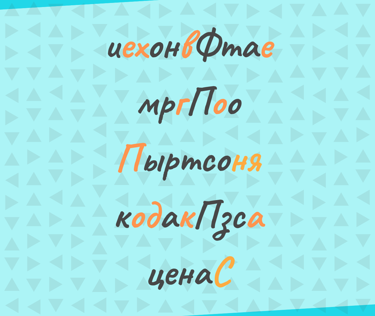 Добрый день! Очень здорово, что вы решили посмотреть эту статью и выполнить задания. Сделали два разных упражнения, одно из которых проверяет внимательность, а другое - умение мыслить нестандартно. Смотрите условия заданий и выполняйте их Ответами можно будет поделиться в комментариях Начинаем! Задание 1 Посмотрите на наборы букв и составьте из них слова Перед вами задание, которое поможет развить скорость мышления. Вам нужно понять, какие слова зашифрованы, и написать их. Так как в русском языке действительно огромное количество слов, то мы решили сделать парочку подсказок: Задание 2 Почти все слова здесь - это "пихта". Однако среди них есть пять других слов - найдите их Спасибо всем за просмотр статьи!