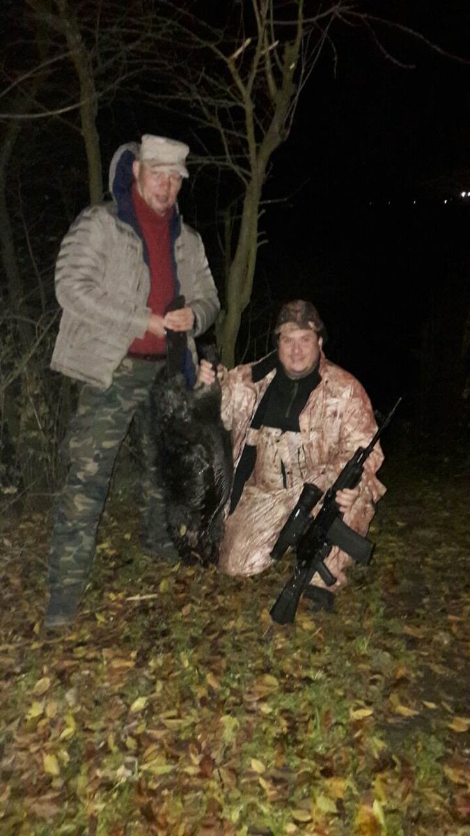 Вернулся домой, сели вечером с супругой ужинать, рассказываю ей про деда "странного", и тут - как "пинок под задницу! Встаю со стула, супруге говорю: - Одевайся, на охоту едем. Она в ответ: - Чо, дебил, какая охота? Время восемь вечера, пока собираешься, пока едем, десять вечера уже будет, а ведь еще и возвращаться. Уговорил, выехали на место. Машину бросил метров за 300 до засидки, нацепил ПНВ, магазин пристегнул, дослал патрон в патронник Сайги, повесил это все себе на шею, и жене говорю: - Садись на шею! Благо весила тогда 48 кг. Она у виска пальцем покрутила, но спорить не стала. Кое как "дополз я с этой ношей" до засидки, супругу спустил с плеч, и говорю: - Дуй назад в машину, сильно топая ногами, и там жди. Только она ушла, я включил прицел, и на воду посмотрел, я даже в засидку не пошел, как супругу спустил с плеч, так и стоял как вкопанный. Почти сразу увидел крупную волну идущую от кустов по направлению к берегу, уже тогда сердце колотилось так что думал за километр слышен стук, и через секунд 10 показались глаза ярко зеленого цвета, присмотревшись я увидел очертания всего Бобра. дистанция была метров 15 не больше, Как мне показалось, он плыл как раз "посмотреть" все ли тихо, ушел ли этот "дебил" который уже год житья не дает. Долго не стал его рассматривать, выцелил между глаз, и уверено нажал на спуск, хлестко щелкнула Сайга, все таки нравится мне ее звук, очень похож на выстрел из "Светки", и в тишине только бурление воды. Положил Саежку на землю, включил фонарь, и на воде уже затихающего Бобра увидел. Заорал от радости так что уши заложило. На мой визг, прибежала супруга. Спрашивает - Ты чего, ногу себе прострелил, придурок? Я только фонариком на затихшего Бобра посветил, и ни чего не сказал. Достал его, и в машину, дома взвесил оказался 32 кг 300 грамм. Ну а после него все охоты проходили по одному сценарию уже без супруги. - Разведка днем, подготовка к стрельбе, вечером выход к берегу, 10 - 20 минут, и выстрел. Больше таких "заморочек", не было! Вот только, на "волнении" своего "первого" Бобра я и не сфотографировал, а когда уже опомнился он уже на половину без шкуры был, фотографировать не стал.