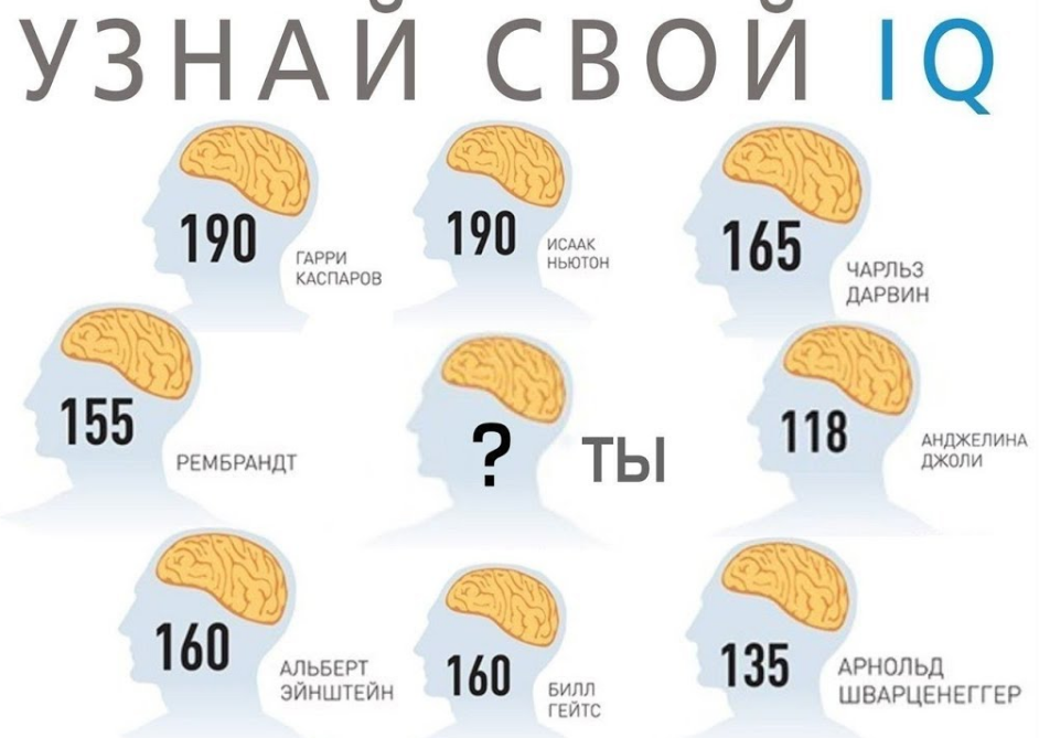 IQ - это английское сокращение от intelligence quotient, произносится как "i-Q". IQ - это количественная мера интеллекта человека, которая определяется с помощью специально подготовленного теста. Это не постоянная величина. Она может меняться с возрастом: увеличиваться у людей, занимающихся саморазвитием, спортом или приобретением полезных навыков, и уменьшаться у тех, кто решил отложить свою жизнь на потом. Показатели IQ также могут иметь четкую тенденцию в зависимости от состояния человека. Многие люди неправильно понимают значение IQ, думая, что IQ отражает степень эрудиции или образованности человека. Это не совсем верно: IQ может оценить способность человека мыслить. Его можно наблюдать в следующих областях: В данном случае за норму принимается средний человек, т.е. индивид того же или среднего возраста. Проще говоря, IQ можно сравнить с ростом. Средний рост российских женщин составляет 166-168 см, а средний рост мужчин - 178 см. Глядя на проходящего мимо человека, ле