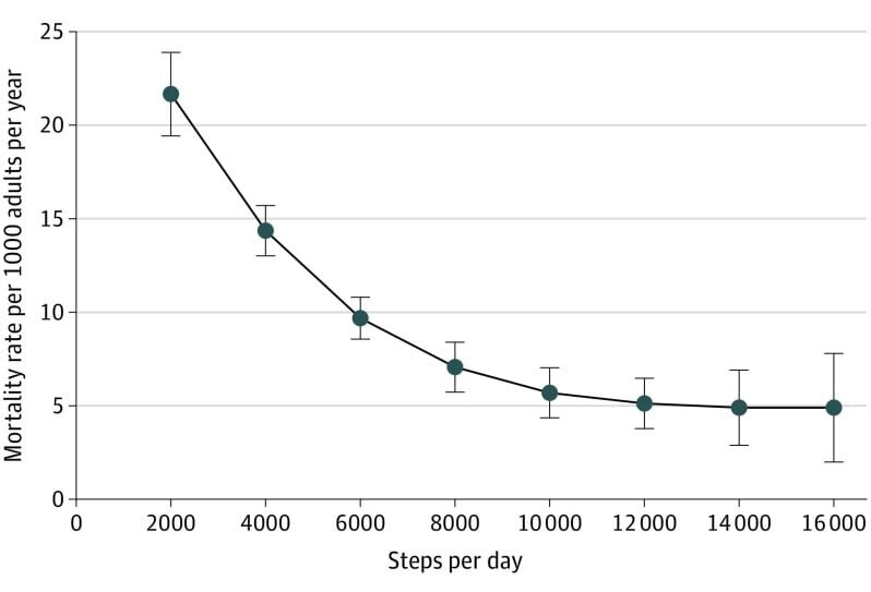 Есть причина, по которой фитнес-трекеры нацелены на 10 000 шагов в день: это магическое число, которое дает вам максимально возможное улучшение. Увеличение количества шагов с 4000 до 8000 в день было связано с ошеломляющим снижением смертности от всех причин на 51% (смертность от всех причин). Кроме того, интенсивность шагов, таких как бег или ходьба, вообще не имела значения! Таким образом, 25 минут на эллиптическом тренажере могут сэкономить вам время в достижении цели по шагам, но каждый шаг будет способствовать вашему долголетию так же, как и обычная ходьба.