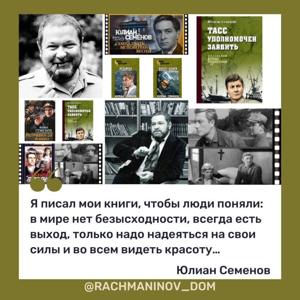 В рамках цикла мероприятий, посвященных 150-летию со дня рождения великого русского композитора Сергея Рахманинова, в "Доме Рахманинова" на Большой Ордынке состоится музыкально-литературный вечер "СЕМНАДЦАТЬ МГНОВЕНИЙ ВЕСНЫ НА ОРДЫНКЕ". Уникальная возможность встречи с дочерью писателя Ольгой Юлиановной Семеновой – российской писательницей, сценаристкой и прозаиком, актрисой, общественным деятелем, публицистом, директором дома-музея Юлиана Семенова в Крыму "Вилла Штирлиц", автором книги "Юлиан Семенов" в серии "Жизнь замечательных людей" изд. Молодая гвардия. Карьеру публициста Юлиан Семенов начал в газете «Совершенно секретно», а со временем создал бестселлер «Семнадцать мгновений весны». О его воодушевляющем и ярком творчестве знает весь мир. Писатель прошел сложный путь, в любых ситуациях всегда оставался добропорядочным человеком. Ценил дружбу и любил близких ему людей. Ольга Семёнова поделится историями (в том числе личными воспоминаниями): о встречах своего отца с Федором Шаляпи