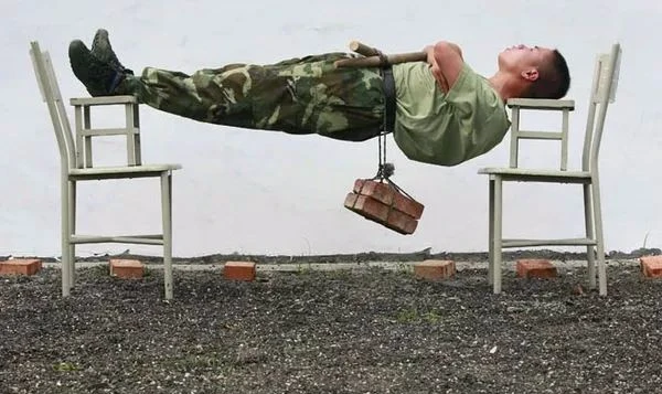 Метод прост: подготовьте два стула одинаковой высоты, лягте на спину на них, при этом верхняя часть тела располагается на стуле только выше плеч начиная с шеи, а нижняя часть тела может опираться только на пятки. Тело по сути подвешено в воздухе, руки естественно расположены на тушке. В прежние времена Наставник ставил светильник или палочки благовоний под ягодицы занимающегося, борясь с провисанием тела у учеников. Начинают с двух минут, постепенно увеличивая время до одного часа. Затем использовали груз, укладывая или подвешивая его в области поясницы. По легендам Мира Улинь, в итоге ученик должен продержаться так с Учителем сверху в течении часа... :)