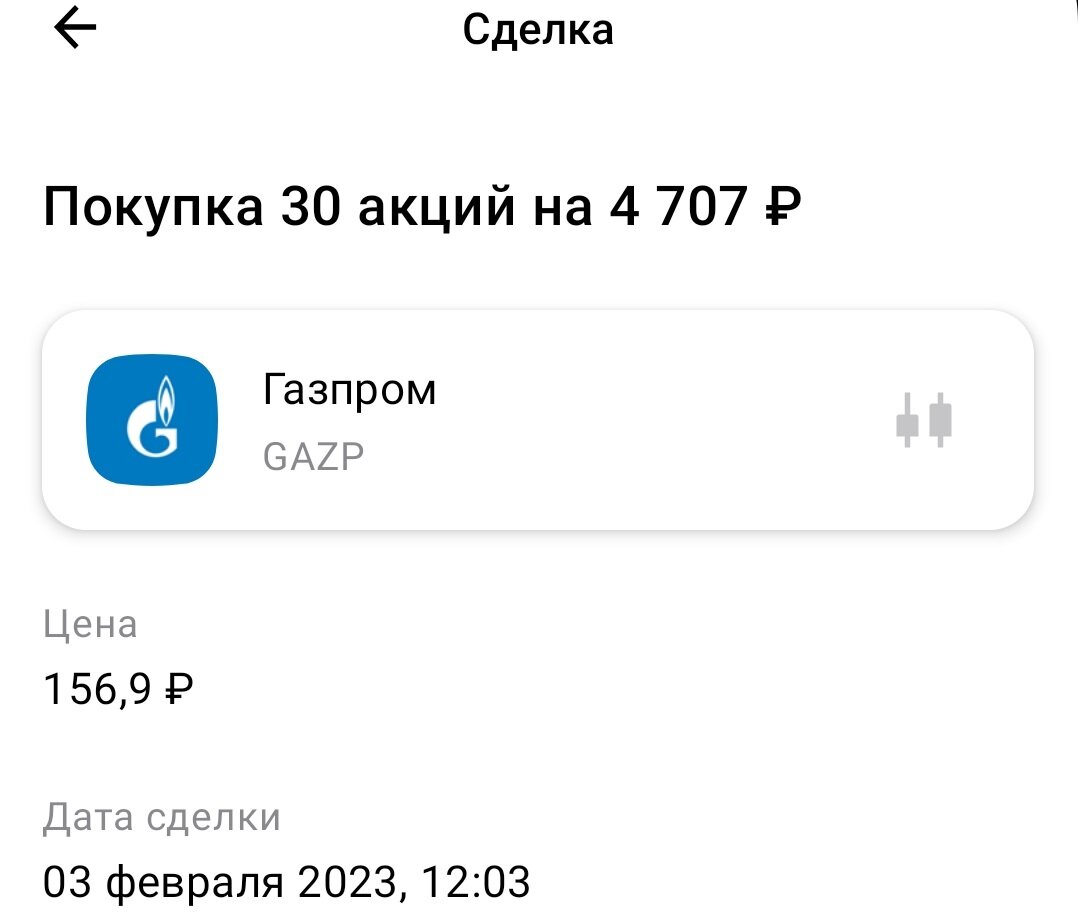 Сработало оповещение о том что стоимость акции Газпрома опустилась ниже отметки в 157 рублей. Было принято молниеносное решение купить на свободные средства (5 000 рублей болталась на счету) 30 акций на сумму 4 707 рублей. Более того, сегодня днем появилась новость о том, что рассматривается предложение МИНФИНа вывести "Газпром" из-под налога на прибыль в 34% для экспортеров СПГ, это повлекло за собой рост акций. В результате имеем чуть больше +3%. Хотя если послушать инвестиционных аналитиков, особого смыла в данной бумаге нет и есть вероятность, что стоимость может скатиться до 130 рублей.