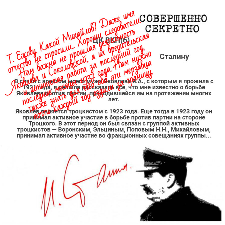 «Т. Ежову. Какой Михайлов? Даже имя отчество не спросили... Хороши следователи. Нам важна не прошлая деятельность Яковлева и Соколовской, а их вредительская и шпионская работа за последний год, последние месяцы 1937 года. Нам нужно также знать для чего оба эти мерзавца почти каждый год ездили за границу.