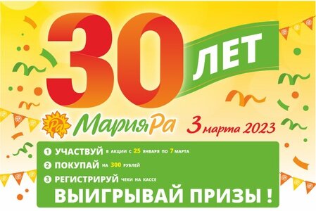 Подробнее https://reklamnyeigry.ru/2023/02/03/30-%d0%bb%d0%b5%d1%82-%d0%bc%d0%b0%d1%80%d0%b8%d1%8f-%d1%80%d0%b0/ Чтобы принять участие в рекламной акции 30 лет Мария-Ра необходимо с 25 января по 07 марта 2023 года: 1. Покупайте любые товары в магазинах сети «Мария-Ра» на сумму от 300 рублей; 2. Регистрируйте покупки на кассе; 3. Выигрывайте множество призов! Призовой фонд: