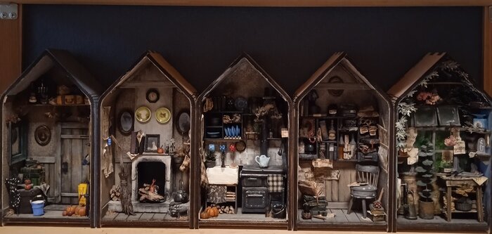 Изначально это должна была быть одна вставка на книжную полку. Но в процессе родилась идея сделать домик, а если точнее развёртку домика. Каждый "скворечник" - это своего рода стена или комнатка. Обстановка и наполнение получились сами собой. Первой была комнатка с камином. Последней - садовая теплица. Сами "скворечники" - это декоративные полки из фикс прайса. Материал: бумага, картон, деревянные шпатели, проволка, бисер, искуственный мох и пр. Стеклянные бутылочки, пару пластиковых тарелок, чайник у камина - купила на Али. Больше комментариев на Пикабу.