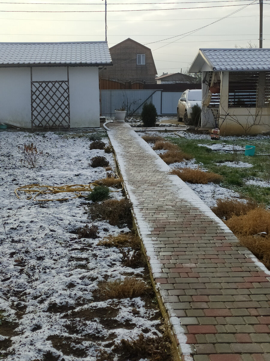 Здравствуйте! Вот такая наша Крымская зима. Это утром, пока чай попил, уже не стало. Приехал с Ялты на свою стройку. Надеялся электрокаменку в Симферополе купить, не срослось. Купил только дверь. Печку заказал на маркетплейсе, думал за неделю придет поставлю, не пришла, Так же заказал в одной из мастерских Феодосии закаленное стекло, восемь миллиметров для перегородки, ждать опять же не меньше недели. Так что парилка откладывается.Будем работать в новом доме. Подмели, прогрунтовали подготовили полы под стяжку. Трубы теплого пола заказывал в фирме Тепло точка, привезли прямо до дома, цена приемлемая. Армировочную сетку раскладывать не стал, плиты с шишечками тоже, плита и так утепленная, так что раскладка трубы выглядит не так красиво, как бы хотелось. Фундаментную плиту вытягивали вдвоем с женой, так что о идеальной ровности никакой речи. Так что и стяжка от трех сантиметров в центре, до семи по краям. Как хорошо, когда на работе такую стяжку делаешь. Купил даже самую не дорогу