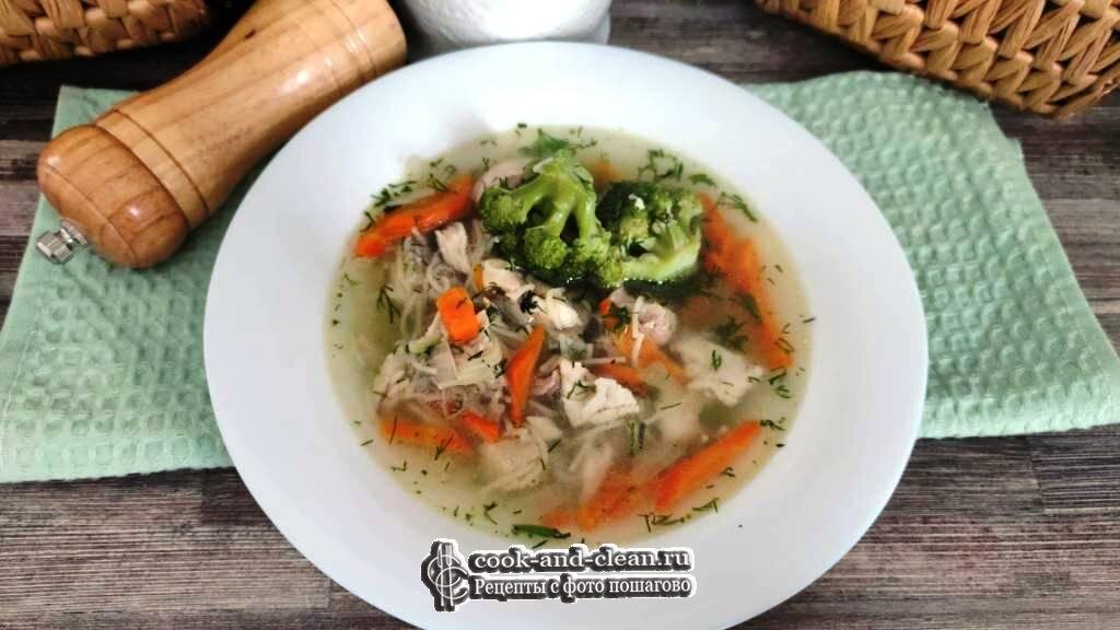 Сегодня на обед у нас был куриный суп с вермишелью без картошки. Готовлю такой суп довольно часто, особенно в те дни, когда планируются вкусные и сытные семейные застолья. Куриный суп с вермишелью без картошки очень подходит в первые дни новогодних праздников. Когда уже надоели слоеные салаты и колбасы, когда хочется на обед что-то лёгкое, простое и вкусное. В кастрюлю с холодной водой отправляю кусочки курицы, довожу все до кипения. Снимаю пену, которая образуется в самом начале. Добавляю лавровый лист, специи, немного соли и варю куриный бульон 30 минут на медленном огне. За это время подготавливаю необходимые для супа овощи. Для начала занимаюсь зажаркой. Нарезаю лук и морковь произвольной формы. И обжариваю их на небольшом количестве растительного масла. Вместо картофеля добавляю в куриный суп брокколи. У меня сегодня замороная, так как готовлю зимой. Как только курица сварится, достаю её из бульона. Мясо разделываю на порционные кусочки и снова отправляю обратно в суп. Следом доба