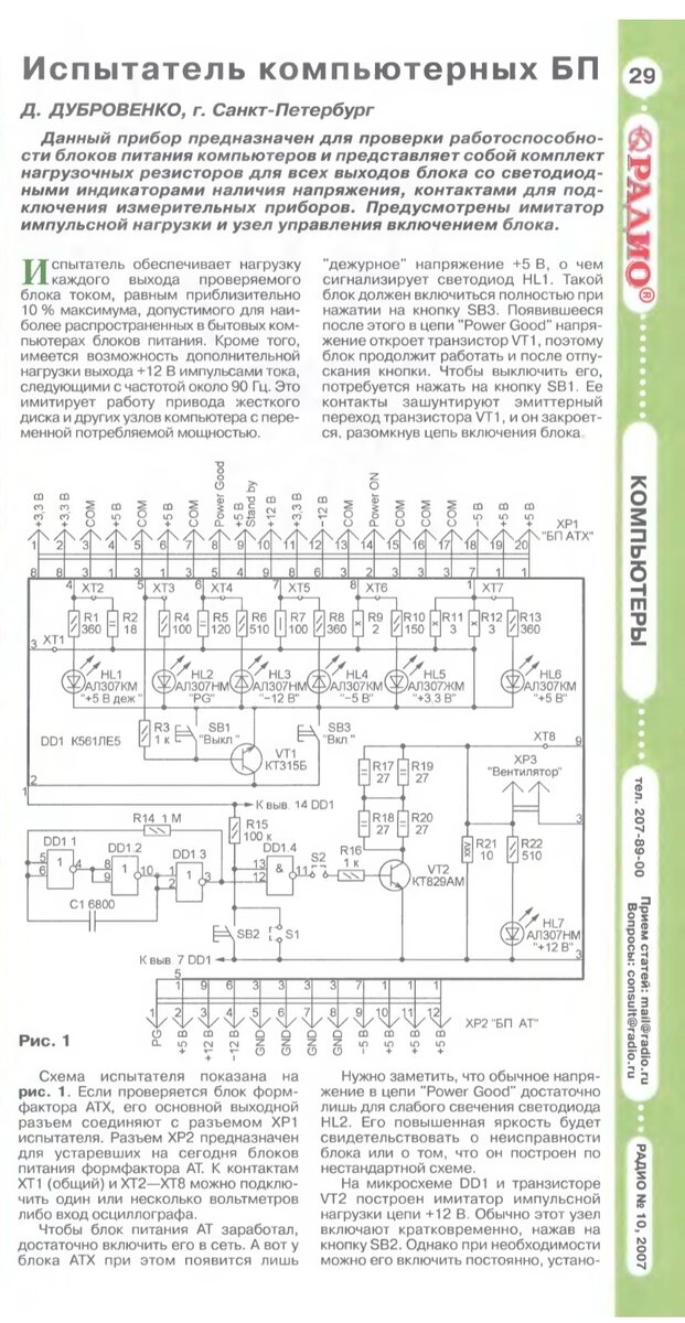 Всем привет! Так уж вышло, что заботы и работы в последнее время стали отнимать почти все свободное время, и в моей крохотной мастерской начали скапливаться долгострои. Описанный ниже проект, как пример такого долгостроя, завершенный за несколько вечеров, потому что моральные силы уже были на исходе. Помимо кучи незавершенных проектов, есть еще куча неисправных компьютерных блоков питания. Чтобы их привести в порядок, их естественно надо обкатывать на какой-нагрузке. Не подключать же к ним исправный комп? Идея построить нагрузочный блок появилась, когда я ознакомился со статьей Д. Дубровенко "Испытатель компьютерных БП" в журнале Радио за октябрь 2007 года: Однако я сомневался стоит ли собирать именно такой испытатель. Например, распайку под АТ разъем можно не делать, так как встретить такой блок питания в 2023 году довольно проблематично. Сомневался я так же и насчет генератора переменной нагрузки, выполненный на логических элементах и биполярном транзисторе. Поэтому я продолжил иска