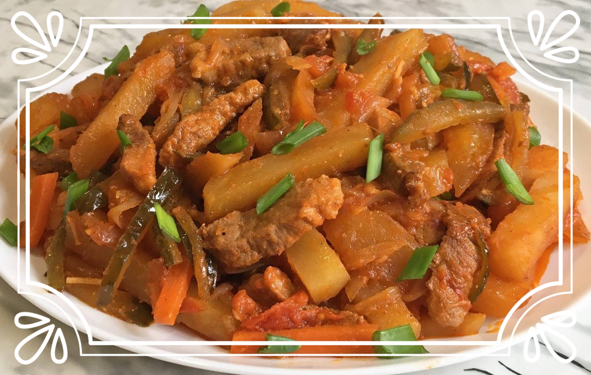 Берут 0,5 кг говядины, луковицу, небольшую морковь, 5 картошин, 3-4 чесночных дольки, 3 помидора, ложку томатной пасты, полстакана масла, 3 средних соленых огурца. Потребуется также подготовить перец, зелень, соль, немного сахара. Мясо нарезают брусочками, обжаривают в глубокой сковородке на масле до получения корочки, слегка подсаливают. Перекладывают в отдельную посуду. В этой же сковороде обжаривают до готовности картофель, нарезанный небольшими брусочками. Выкладывают его в миску. Возвращают в сковороду мясо, добавляют полукольца лука и брусочки моркови. Блюдо томят на малом огне до мягкости моркови. Кладут порезанные помидоры и пасту. Если нужно, то добавляют немного сахара. Подлив воду (при необходимости), тушат мясо с овощами около 15 минут. Добавляют нарезанные огурцы и тушат еще минут 40. Когда половина жидкости выпарится, добавляют жареный картофель и измельченный чеснок. Продолжают готовку еще минут 5-7. Подают азу, посыпав рубленой зеленью. Приятного аппетита!