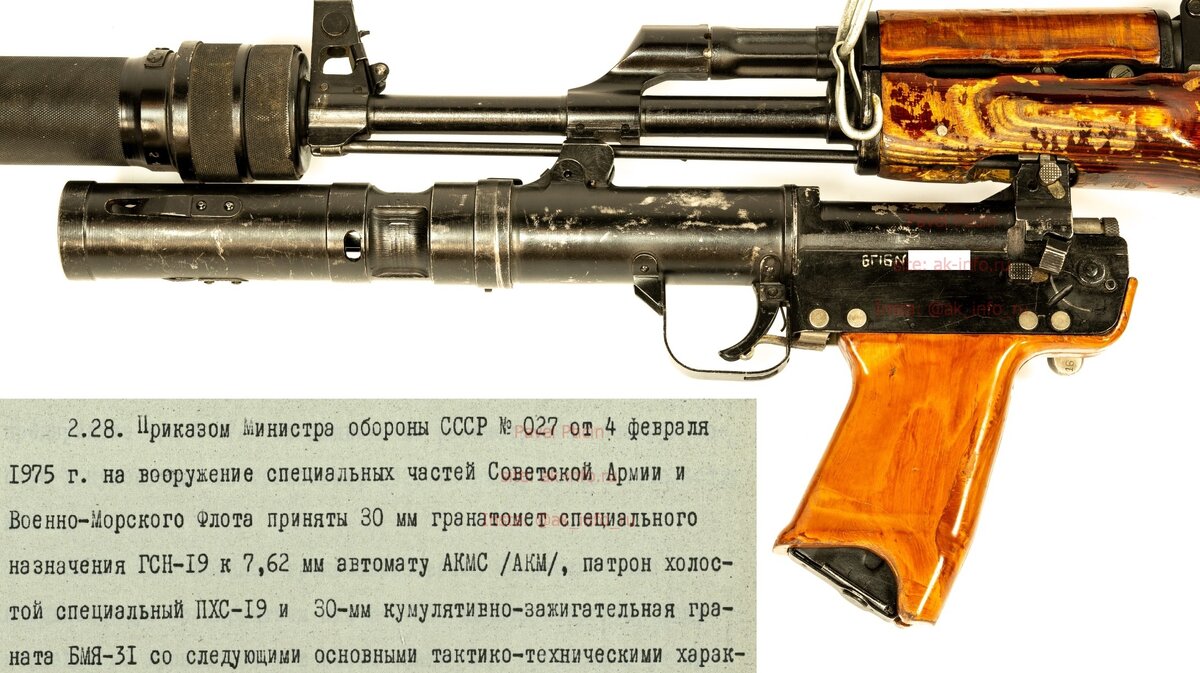 Приказом Министра обороны СССР, сегодня, 4 февраля 1975 г., на вооружение частей спецназа ГРУ в составе 7,62/30-мм специального стрелкового комплекса 6П15 приняты подствольный гранатомет ГСН-19, вышибной патрон ПХС-19 и 30-мм граната БМЯ-31, сумки для них.