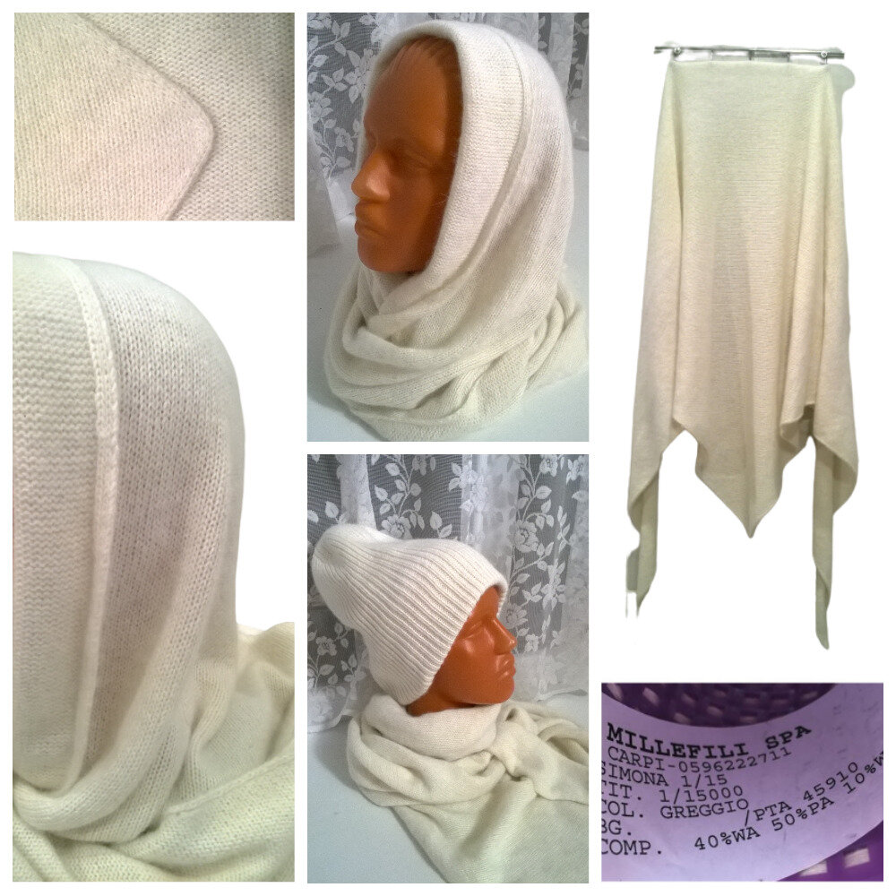 Косынка связана из пряжи толщиной 1500 метров/100 грамм в 3 нити (500 метров/100 грамм), вес 160 грамм. Каретка справа, выдвигаем 3-4 крайние иглы в ПРП, обвитием или «косичкой» набираем петли, вяжем ряд, каретка слева: Деккером переносим петли в следующей разбивке: 2петли в РП — 2 иглы в ЗНП- 1петля в РП- 2 иглы в ЗНП- 1 петля в РП. Выдвигаем пустую иглу справа в РП, вяжем один ряд, на игольнице 2РП-2ЗНП-1РП-2ЗНП-2РП. По двум «дорожкам» от игл в ЗНП потом наберем 2 ряда петель, которые стабилизируют край косынки. Далее прибавляем справа каждые 2 ряда по одной петле с помощью 2-игольного деккера, перенося петли вправо, а на пустую иглу надевая протяжку от петли: По мере прибавления петель добавляем большую оттяжку полотна: Таким образом вязать до желаемой ширины косынки (у меня до 95 иглы). Далее убавлять тем же 2-игольным деккером по одной петле через 2 ряда. Петлеуловителем поднять 2 ряда петель по протяжкам, получится 7 петель: Петли надеть на игольницу и, убавляя по петле, провяза