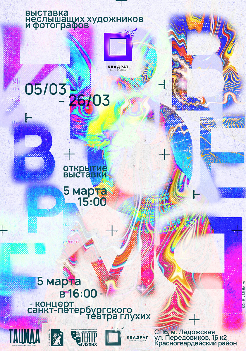 🔔Церемония Открытия Выставки неслышащих художников и фотографов "Новое время" состоится 5 марта 2023 года в 15.00, в Доме молодежи «Квадрат» по адресу: Санкт-Петербург, ул. Передовиков, д. 16, корп. 2. После завершения Церемонии Открытия выставки в актовом зале пройдет праздничный одноименный концерт Санкт-Петербургского театра глухих. Вход на выставку и концерт бесплатный (по предварительной записи).