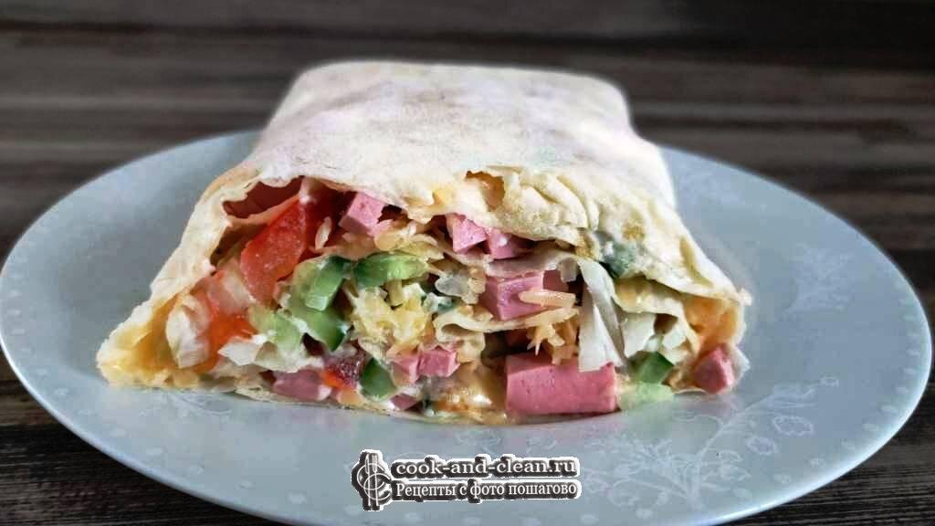 Лаваш с сыром и колбасой — это быстрый перекус в течении дня, который может приготовить себе даже школьник. Можно такой лаваш с сыром и колбасой сделать на завтрак, тем самым разнообразить горячие бутерброды новым рецептом. Сыр можно брать абсолютно любой, подойдет как твердый, так и плавленый. Такой лаваш с сыром и колбасой можно приготовить заранее с вечера, а утром немного подогреть его на сухой сковороде или в микроволновой печи. Сыр растает и скрепит между собой все ингредиенты. Тогда есть такой лаваш будет намного удобней. Лаваш с сыром и колбасой можно разбавлять каждый раз новыми продуктами. Можно добавить малосольные огурцы, морковь по — корейски или капусту. Вот что есть в холодильнике, то и добавляйте. Лаваш смазываем несколькими столовыми ложками майонеза, разпределяя его равномерно по всей поверхности. Репчатый лук нарезаем очень тонкими полосками и выкладываем первым слоем. Затем нарезаем мелко помидор и равномерно распределяем его по всему лавашу. Затем нарезаем мелко по