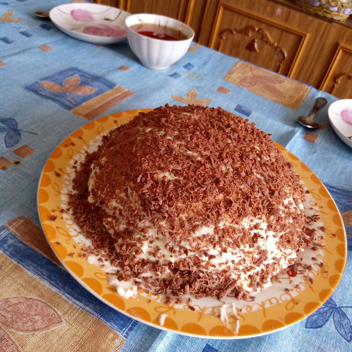 1,5 ст муки 0,5 банки сгущенки , 2 яйца 1 стакан сахара 1 ч л соды 200 гр сметаны (неполный стакан ) Крем : 100 гр масла 0,5 банки сгущенки Приготовление : В сметану положить соду , погашенную уксусом , сахар тщательно размешать , разбить 2 яйца , сбить их и влить в тесто , добавить 1/2 банки сгущенки , перемешать , понемногу всыпать муку , получится тесто гуще сметаны . Тесто разделить на 2 части , 1 часть вылить на смазанную маслом сковороду и выпекать . Во вторую часть добавить 1 ст л какао , перемешать и тоже выпекать . Готовые коржи разрезать пополам , получится 4 коржа . Сбить и смазывать коржи темным шоколадом. Приятного аппетита!!