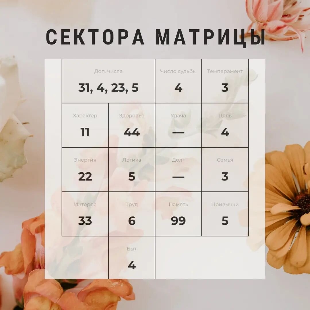 Сложив воедино каждый сектор, можно с невероятной точностью охарактеризовать человека.👤❓ Свои показатели можно узнать рассчитав матрицу по ссылке 👉 https://new.nenumerol