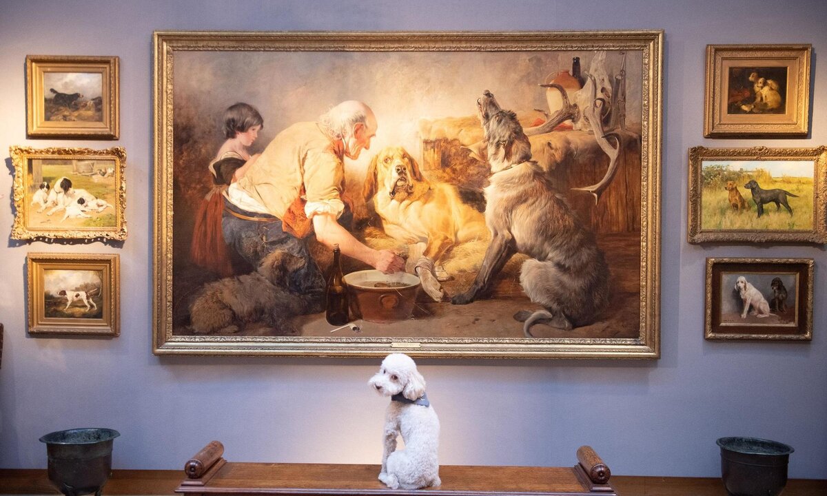 В кадре: «Я тоже вырасту таким большим?» Великобритания, Лондон. Собака сотрудницы аукционного дома Christie's осматривает картину Ричарда Ансделла «Раненый охотничий пес» в преддверии продажи крупной частной коллекции предметов искусства и интерьера, насчитывающей около 270 лотов. Это полотно середины XIX века оценивается в 200-300 тыс. фунтов. О том, как устроены аукционы, на которых с молотка уходят произведения современного искусства, читайте в материале «Вокруг света».