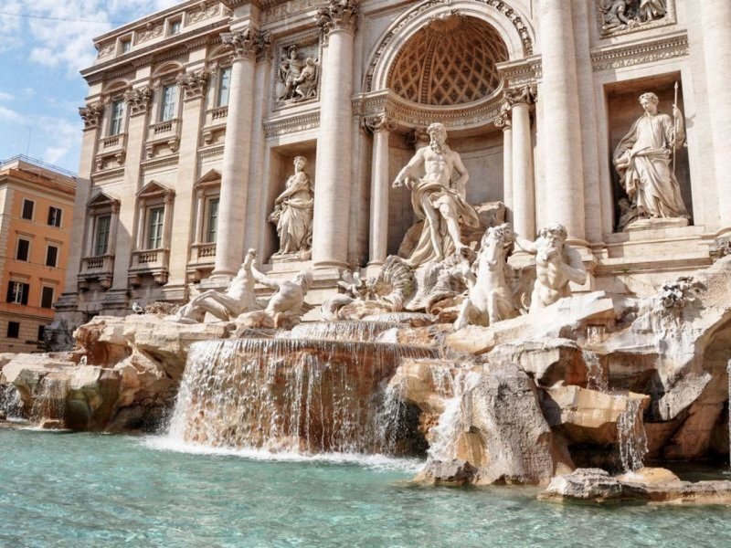 Фонтан Треви был построен в 1762 году по чертежам Николо Сальви и по сей день является одной из ярчайших достопримечательностей Рима. Фонтан представляет собой мраморный монумент, изображающий бога Нептуна в колеснице, выпрыгивающих из волн коней, дельфинов, рыб и прочих морских существ.