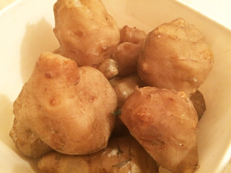 Салат из Топинамбура очень полезный. Как говорит моя соседка - от 200 проблем организм избавит, правда не вдаётся в подробности. от каких. Но что точно так это если употреблять его регулярно, то наведёт порядок в организме, поскольку содержит много клетчатки и будет действовать как эффективное очистительное средство для организма. В нашей семье Топинамбур хорошо прижился. Неприхотлив в выращивании, впрочем, как любой сорняк, растёт и растёт сам по себе. Главное, не дать ему "взять вверх над разумом", то есть начать вытеснять с огорода другие овощи, да и к соседскому забору близко сажать не стоит, а то переметнётся))), не все бывают рады такому гостю))) Но вернёмся к салату. Он очень простой. Ингрдиенты: 500 г топинамбура 100 г консервированной кукурузы 4 яйца Натуральный йогурт для заправки (можно заменить сметаной ли майонезом) Соль по вкусу Зелень Приготовление: 1. Отварила топинамбур в течение 5 минут после закипания. Я уже как-то писала. что особо с топинамбуром не заморачиваюсь,