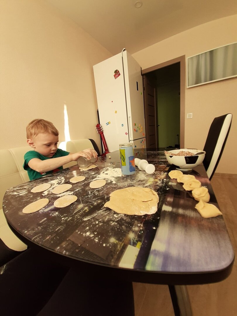 Когда я первый раз решила слепить пельмени с ребёнком, я возненавидела весь мир))) Я не поняла откуда берутся инста-фоточки милых детей, перемазанных мукой. И так чистенько на кухне, аккуратненько. У нас же по кухне прошёл Мамай. Я уже не помню, что я делала не так, но всё не задалось с самого начала. Кто знает рецепт классных самодельных пельменей, пишите в комментариях. Тесто прилипало к столу, пельмени получались толстыми, Дима накладывал слишком много мяса, в итоге всё разваливалось на глазах. Ещё секунда и я бы выбросила всё в помойку, если бы на помощь не пришёл муж. Он как-то очень быстро завершил этот процесс и я выдохнула навсегда. Больше я не бралась за это дело. Но так как Дима взаимодействовал с тестом очень воодушевлённо, я решила сделать ему цветное для игры. Цветное тесто. Дима любит играть в пластилин. Поэтому самодельное тесто было как нельзя кстати. И получилось у меня здесь всё намного лучше, чем с пельменями. Дима очень любит яркие, радужные цвета и тесто мы сделали