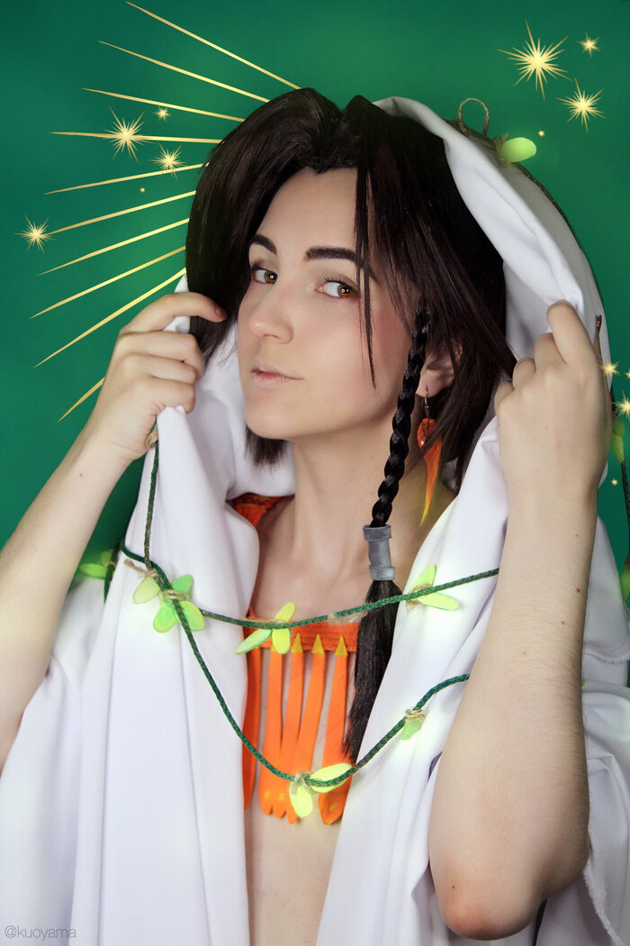 Сегодня я хочу вам показать косплей, сделанный в домашних условиях! Референсом была обложка манги Shaman King Zero! Это приквел к основной истории, данный том содержит несколько историй о Йо и его друзьях до начала развития событий в Токио 98-ого года и Турнира Шаманов соответсвенно: Парик на Йо у меня изначально уже был, передо мной стояла задача сделать остальные атрибуты с обложки, и всё вышло довольно-таки просто) Косичку я приобрела отдельно на Вайлдберисе, сделала для неё серебряную пимпочку из евы и саму косу просто вплела в парик/ Серьга и ожерелье мой крафт, всё сделано из евы) Лоза верёвочка из фикспрайса, а зеленые вставочки отлиты из горячего клея и прокрашены) наконец так называемый плащ это просто обычный кусок габардина, даже не простроченный х) просто накинула на себя. И вот как мы фоткались! Просто закрепили кусок зеленой ткани на шкаф и поставили две кольцевые лампы: Готовые фоточки ниже! Мне нравится то, что получилось, делала для себя, к сожалению про мангу Шаман Ки