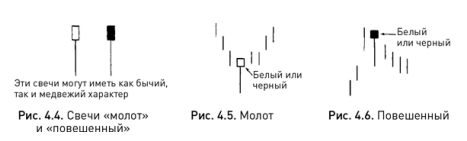 На рисунке 4.4 показаны свечи с длинными нижними тенями и маленькими телами, находящимися в верхней части ценового диапазона. Удивительная особенность этих свечей заключается в том, что они могут быть как бычьими, так и медвежьими в зависимости от рыночной тенденции в момент их возникновения на графике. Если тренд нисходящий, то следует ожидать его завершения, а свеча в этом случае будет называться молотом (см. рис. 4.5). Интересно, что ее японское название — такури, что в буквальном переводе означает нечто вроде «попытки измерить глубину, нащупывая дно ногой».