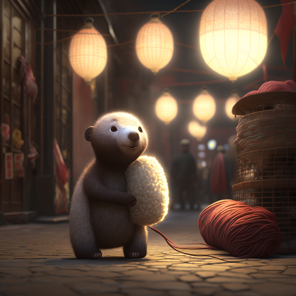Создать: Норка животная, мотки пряжи, тележка, китай, пиксар, свет, радость, драматический свет, светло, высокое качество.