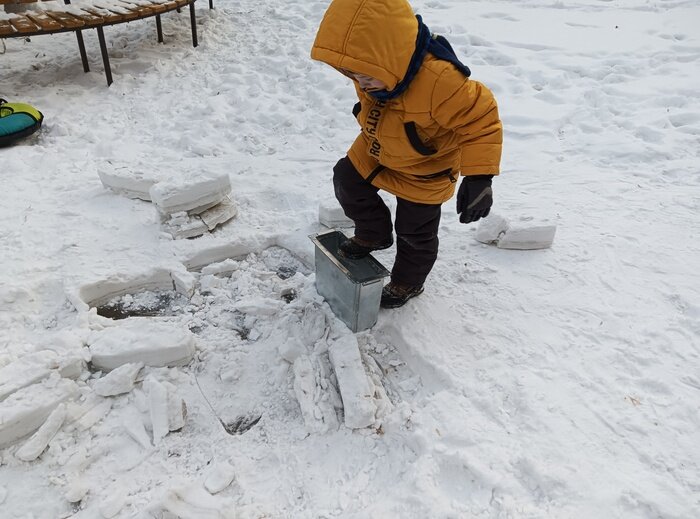 Форма из одного моего предыдущего поста снова пригодилась. На этот раз в роли вырубного штампа. Не силён в терминологии - поправьте если ошибся. Прессовка кирпичей из снега стала не актуальной. Долго приходится ждать, пока кирпич обретёт прочность, достаточную для его транспортировки к месту строительства. Решили вырубить пару штук из наста на детской площадке. Сразу несколько плюсов. Быстро. Очень прочные получаются. Ну и очистка от снега площадки. Быстрее весной оттает. Из минусов - ребёнку тяжеловато. Помощники подтянулись и буквально за час или немного больше у нас получилась вот такая конструкция. Из лайфхаков, для того, чтобы стенка не развалилась, швы между ними сразу притирал снегом. На следующее утро схватились окончательно. Следующим проектом стало строительство берлоги. Снега куча, энергии хоть отбавляй. С вечера накидали и утрамбовали горку снега. Утром приступили к рытью. Норка получилась вместительная. На удивление сооружения простояли дольше чем думал. Обычно на второй д