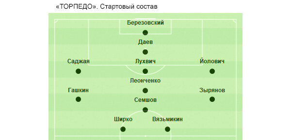 «Торпедо»: Березовский (Воробьёв, 23), Зырянов, Саджая, Йолович (Камольцев, 79), Даев - к, Лухвич, Гашкин (Панферов, 85), Вязьмикин, Ширко, Семшов, Леонченко.