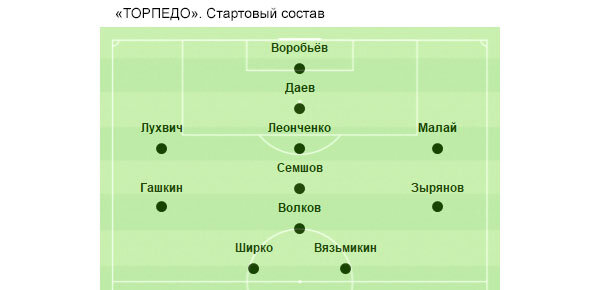 «Торпедо»: Воробьёв, Малай, Зырянов, Леонченко, Даев - к, Лухвич, Гашкин, Вязьмикин, Ширко (Камольцев, 63), Семшов, Волков (Кормильцев, 57).