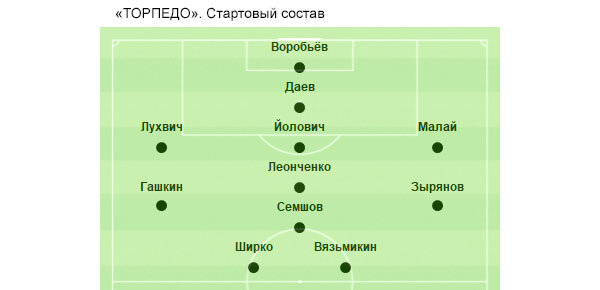 «Торпедо»: Воробьёв, Малай, Зырянов, Йолович, Даев - к, Лухвич, Гашкин (Аджинджал, 81), Вязьмикин, Ширко, Семшов, Леонченко.
