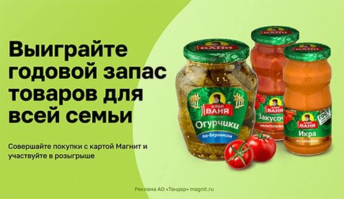 Подробнее https://reklamnyeigry.ru/2023/02/04/%d0%b3%d0%be%d0%b4%d0%be%d0%b2%d0%be%d0%b9-%d0%b7%d0%b0%d0%bf%d0%b0%d1%81-2/ Чтобы принять участие Годовой запас необходимо с 01 января по 28 декабря 2023 года: 1. Совершать покупки продукции, участвующей в акции, в магазинах «Магнит Семейный» и «Магнит Экстра» с картой Магнит: 2. Получите ежемесячный шанс выиграть годовой запас товаров. Игровая продукция, участвующая в акции: