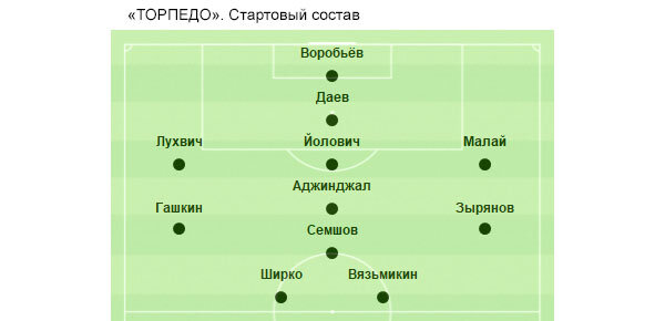 «Торпедо»: Воробьёв, Малай, Зырянов, Йолович, Даев - к, Лухвич, Гашкин (Саджая, 56), Вязьмикин, Ширко, Семшов, Аджинджал (Кормильцев, 56).