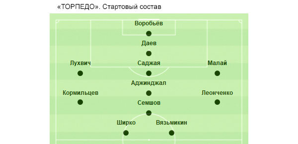 «Торпедо»: Воробьёв, Малай, Саджая (Гашкин, 58), Леонченко, Даев - к, Лухвич, Аджинджал, Вязьмикин, Ширко (Оганян, 71), Семшов, Кормильцев (Фамильцев, 85).