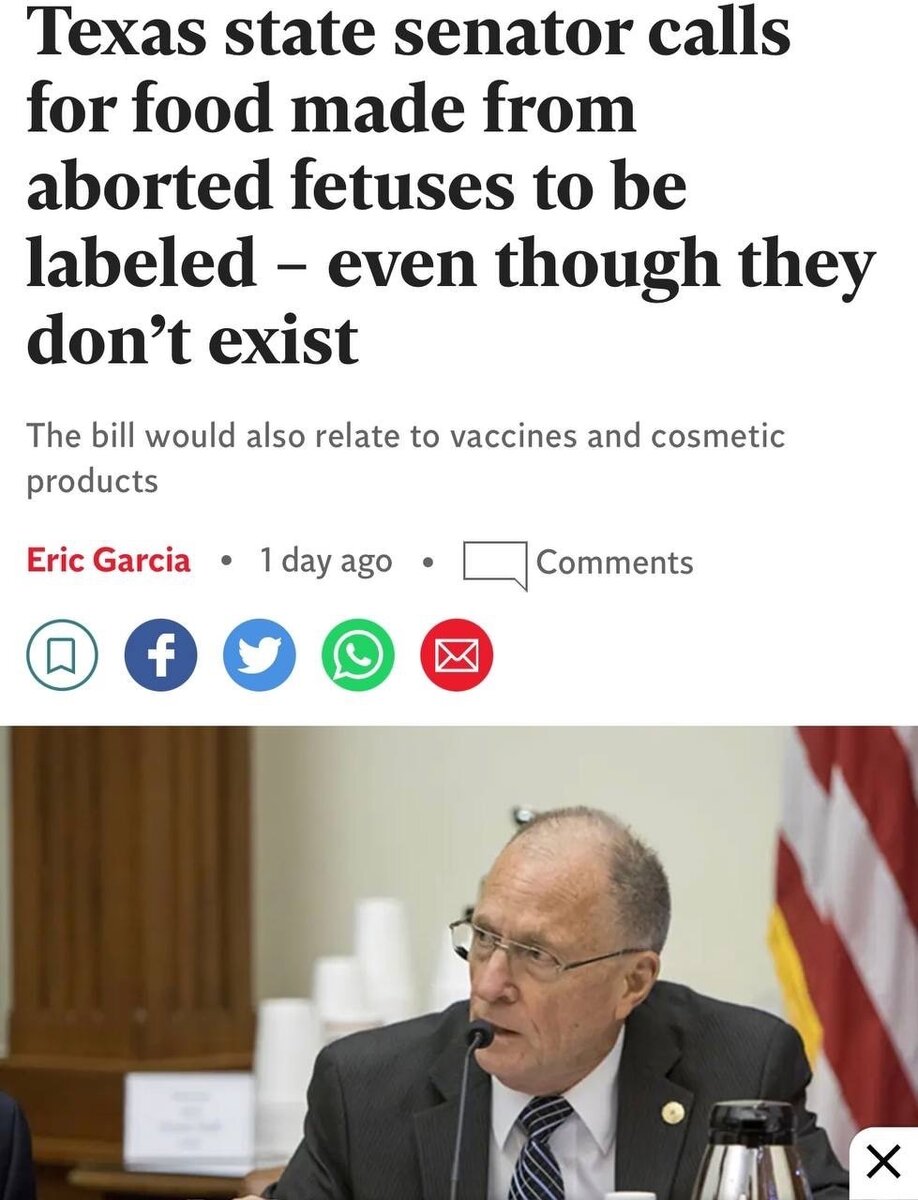"В парламент Техаса внесли законопроект об обязательной маркировке продуктов, которые содержат ткани абортированных детей.