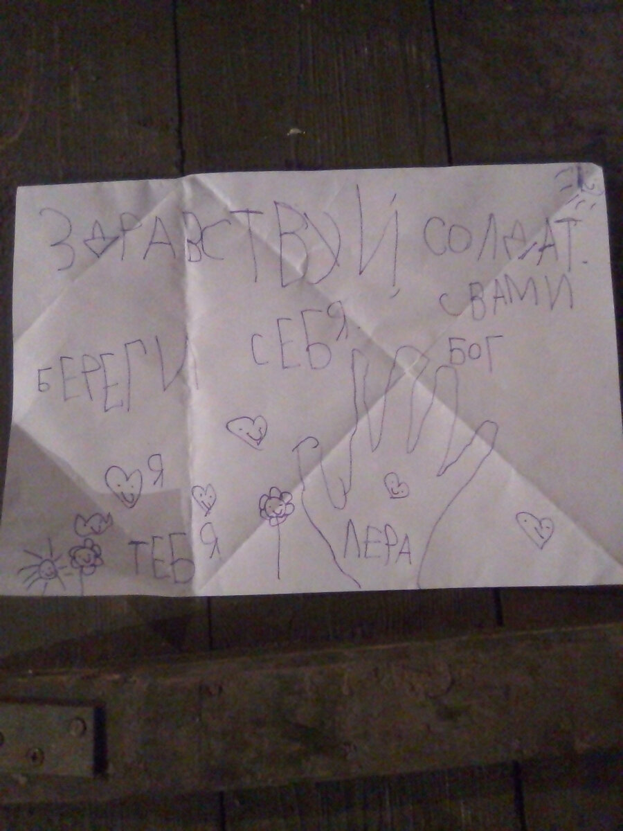 Три дня назад мой сослуживец зашёл в магазин . Было это в одном селе Белгородской области . К нему подошли папа с маленькой , года три , дочкой . На вопрос :,, Вы солдат ? " сослуживец ответил утвердительно . Тогда девочка протянула конверт , сказав : ,, Это тебе .'' Вот это письмо ...