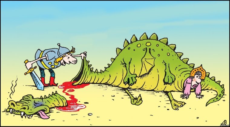 - Было в том царстве все распрекрасно! Коровы доились и солнышко ясно! И правил тем царством, сам батюшка-царь, Ну, словом, такая идиллия встарь! Но, видно, уже был тот Мерфи закон И в царстве решил поселиться дракон! И батюшка-царь испытал лёгкий шок, Когда этот зверь часть поселков пожёг! И царь собирает военный совет, Дать надо зверюге достойный ответ! Сначала заслушали с МИДа посла (Туда змей проклятый свой райдер заслал) И батюшка-царь вопросил дипломата: - И что, доложи, тому аспиду надо? - На Медную гОру он глаз положил, Мол, прадед – Горыныч, с хозяйкой там жил! Он, что-то нашел, паразит, в Конституции И требует, ящер, теперь реституции! - Так, ежели, дело в одной той горе, Так пусть поживет! Чай зима на дворе! Но надо легонько ему намекнуть, Нехай по весне отправляется в путь! - Но, батюшка-царь! Пунктик есть ...тута вот, Потребовал змей пару девственниц в год! И батюшка-царь распахнул левый глаз! - Вот это хреново! Он сдохнет у нас! И встал со стола богатырь тут – Иван, Махнул пенной браги литровый стакан! - Считаю, что зверя прогнать – по уму! А девственниц это... нужны самому! (Раскланялся он, наслаждаясь моментом, Средь бурных, собравшихся, аплодисментов!) Весь город Ивана сбирал в дальний путь! - С победой вернусь! Не успеешь мигнуть! На лошадь Иван без разбега залез, Легонько пришпорил и тронул сквозь лес! Но не был тогда сильно развит ГЛОНАСС Маршрут пролагали по солнцу, на глаз! Не буду описывать всех испытаний, Что вынес Иван за всё время скитаний, Но как с новобрачной жених под венец, С конем он к пещере пришел наконец! Пещера огромна! Глазам не поверь! Каких же размеров скрывается зверь? И воздуха в грудь Ваня больше набрал И что было мочи туда заорал: - А ну-ка, шершавый, вылазь-ка на бой! Ответишь за райдер сейчас головой! За девственниц наших в бою постою! И кинул в пещеру перчатку свою! Обиженный голос заполнил пространство: - Скажи ты, мне, Ваня! Откуда в вас хамство? Вот если собрался ты ворога бить, Зачем же пытаться его оскорбить? Зачем ты, Ванюша, мне в попу орал? Железной перчаткой попортил анал...