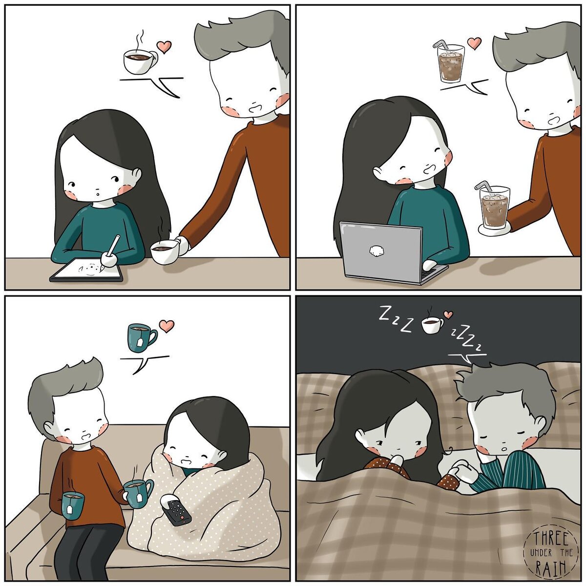 А вот чувствую я, что нам всем сейчас необходимо что-то очень милое, нежное и теплое. Погода не дает возможности расслабиться. И особенно в Питере. То оттепель с промозглым ветром, то похолодание. Сейчас у нас похолодание и снежок, но через пару дней опять обещаюсь ветер и слякоть с плюсовой температурой. А потом опять холод и снег. В любом случае, даже, когда на улице плюс, необходимо кутаться в теплую одежду, ведь по ощущениям на улице существенный минус. И все-таки, помимо теплой одежды, нас спасает тепло близких нам людей: семьи, друзей, возлюбленных (сразу видно мои приоритеты, да?). Так что, напишите своим родным пару приятных слов, подарите им заряд тепла вашего сердца, и поверьте, они его только удвоят! А еще напишите что-то приятное в комментариях, чтобы согреть как можно больше людей! Я очень радуюсь, когда читаю ваши комментарии. Вы заряжаете меня позитивом и мотивируете и дальше выпускать комиксы! Автор комикса: threeundertherain