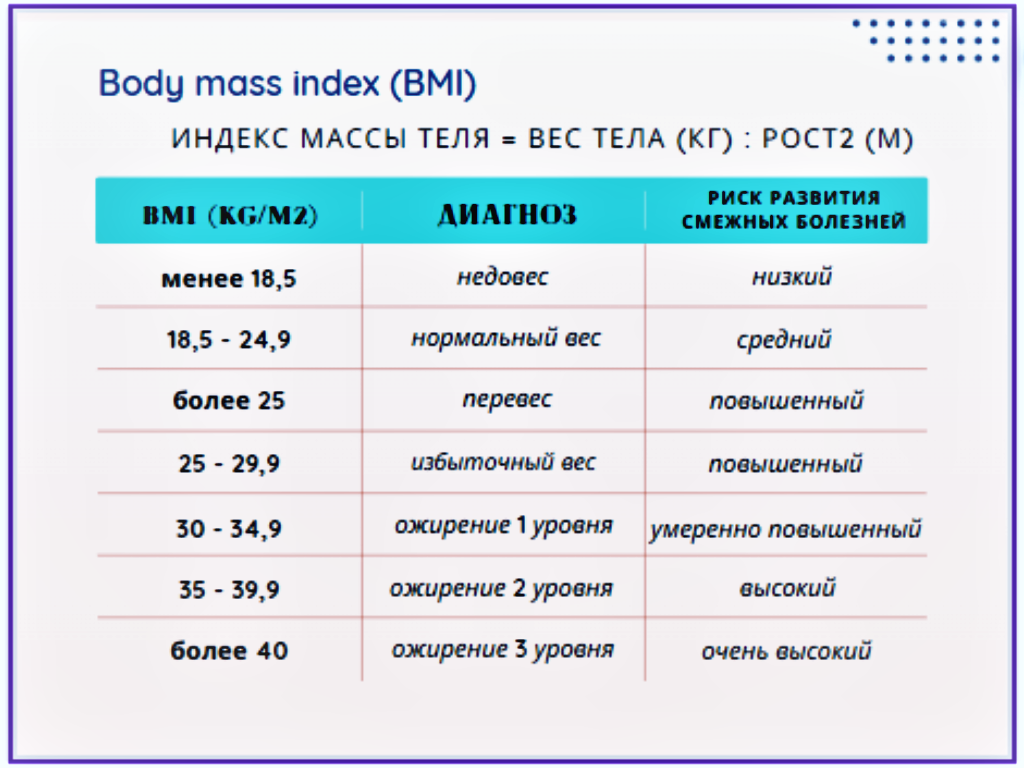 Повсеместно применяемый индекс массы тела (ИМТ), или body mass index (BMI) (вес тела в киллограмах разделить на квадрат роста в метрах) не является обсолютным и универсальным. Врачи спортивной медицины и диетологи сегодня все чаще предпочитают измерять у пациентов с развитой мускулатурой охват талии – WHtR ([охват талии (см): рост (см)] x 100), чтобы убедиться в отсутствии отложения висцелярного жира в брюшной полости. Ведь, к примеру, их высокий показатель ИМТ может является контотацией большого веса мышечной массы. Именно такие замеры ожирения в брюшной полости однозначно более валидны, так как показывают, где именно скапливается жир.