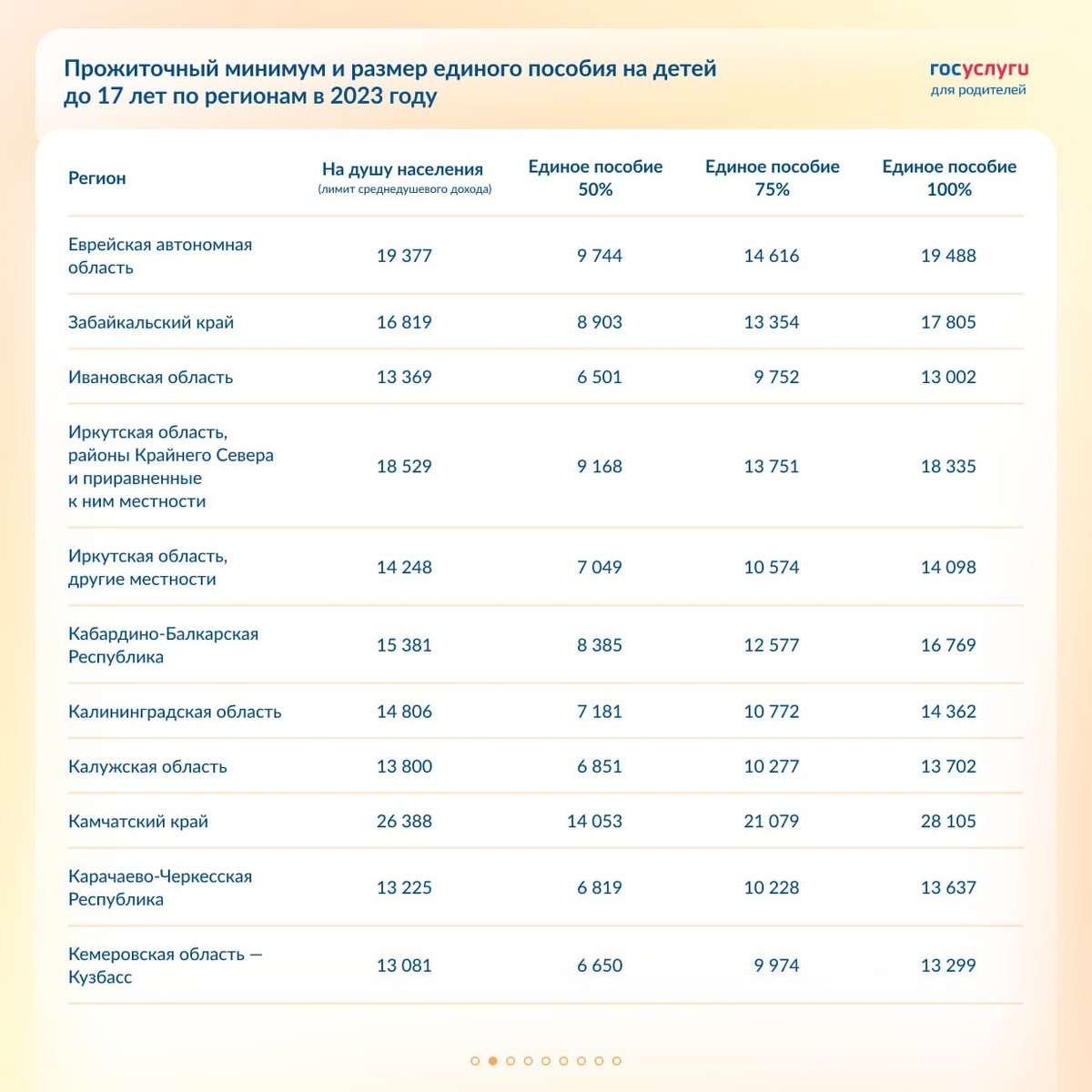 Специалисты Госуслуг рассказали о лимите дохода и размере единого пособия на детей в каждом субъекте Российской Федерации. В Telegram-канале «Госуслуги: для родителей» опубликовали полезную информацию о новом пособии, которое с 2023 года выплачивает Социальный фонд России. «Единое пособие на детей до 17 лет назначается, если среднедушевой доход семьи не более прожиточного минимума на душу населения в регионе», - рассказали в ведомстве. Специалисты объяснили, что это первая колонка с числами в опубликованных карточках. Размер выплаты составляет 50, 75 или 100% регионального прожиточного минимума для детей. Это три следующих колонки с числами. «В некоторых регионах установлены прожиточные минимумы для разных климатических зон. Это тоже учтено», - рассказали специалисты. Жители любого субъекта с помощью таблиц могут найти свой регион и узнать, положено ли им единое пособие и каким оно может быть. Например, среднедушевой доход семьи с двумя детьми из Тверской области — 11 800 рублей. Про