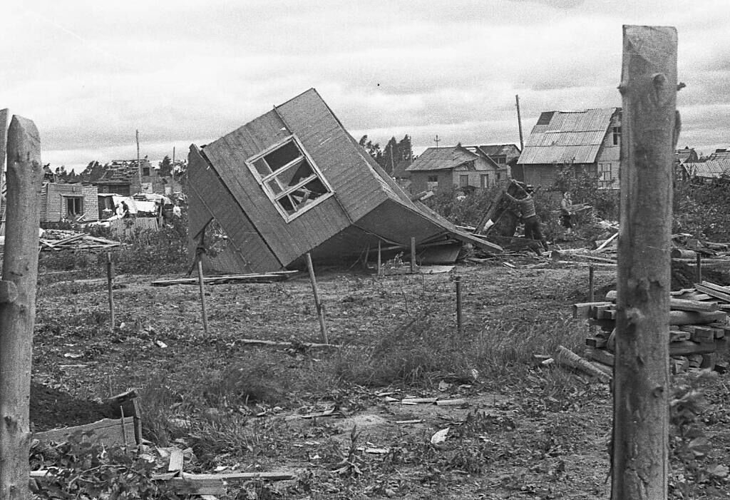Смерч 1984 г Иваново В 1988 году на мосфильме был снят художественный фильм " Запретная зона ", автором сценария и режиссёром которого был Николай Губенко. Фильм рассказывает о последствиях ивановского смерча, внимание акцентировано на проблеме равнодушие тех кто не пострадал от стихии, к чужим бедам. Была создана также музыкальная поэма композитора Валерия Белунцева, который был очевидцем этих событий. Очевидцами этих событий были также мои мама и папа-мои родители. Об этом я расскажу немного поподробнее с их слов ,которые мне запомнились с точностью до " запятой ". Была запланирована у моих родителей поездка на дачу в местечко Дегтярёво. Мама приходит с улицы домой и говорит : "Давай завтра поедем время уже 4:00 вечера, поздновато!"Итут же она рассказывает ,как На улице её насмешили соседи: "Рая, пойдём с нами там, говорят коровы летают, ха-ха-ха ". Посмеялись вместе, мама подумала, это шутка стопроцентная.