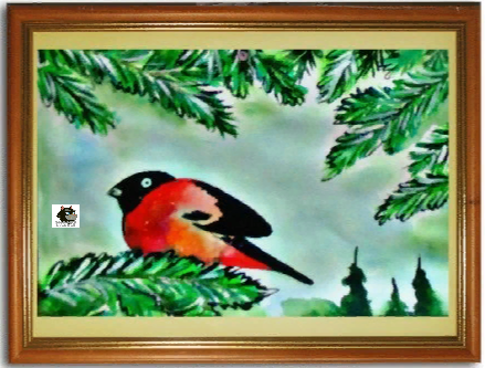 Убираем лишнею краску сухой кистью, подрисовываем основу хвоста. Снегиря оставляем сохнуть и переходим к ёлочкам. В еловые ветви добавляем изумрудного цвета-подрисовываем иголочки легко и хаотично.