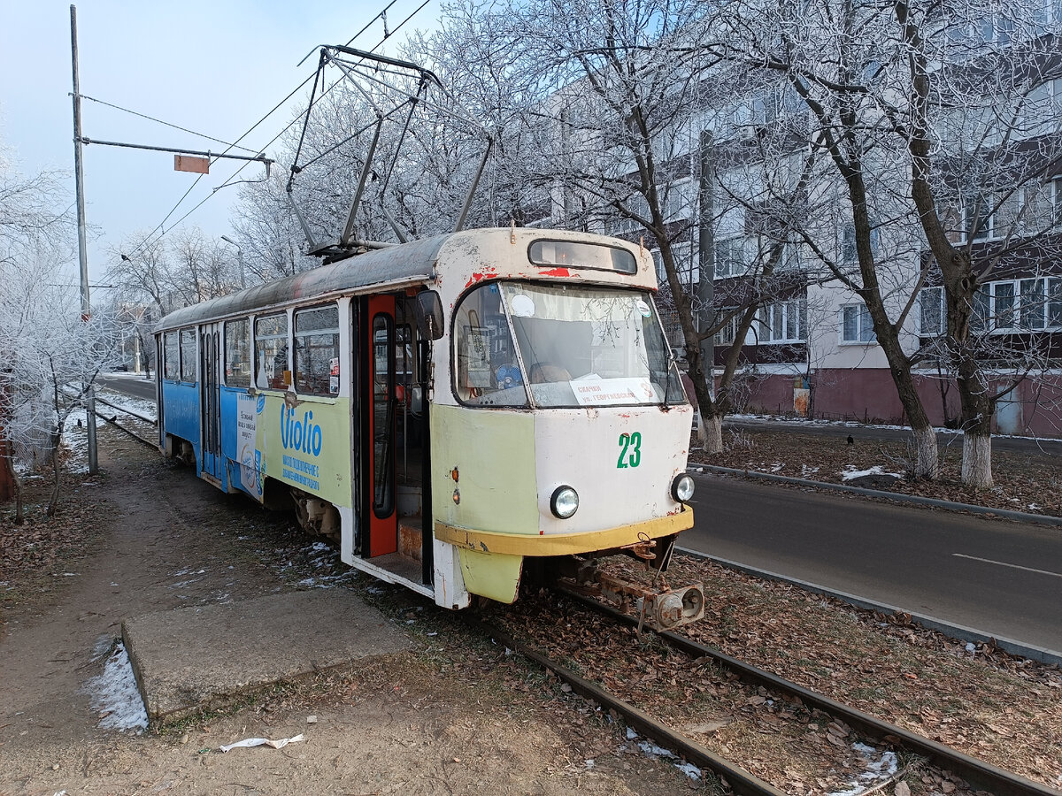 Снова здравствуйте,сегодня я пишу про вагоны от 23 до 109. И нет, здесь не будет написано про 86 вагонов (кто о таком может додуматься). Просто после 27 вагона идет огромная брешь в номерах, потом 59 и снова. После 59 идет 101.Надеюсь, вам будет интересно. Вагон 23 это Tatra T4D 1979 года выпуска. В Пятигорск был привезён в 2003 году. Имеет модифицированные окна и двери Вагон 24 это "музей" в депо номер 1 на жд вокзале. Это также T4D . Был выпущен в 1978 году, и куплен Пятигорском в 2002 году Далее вагон 25,26 и 27 это Tatra T4D. 25 и 26 куплены Пятигорском в 2003 году, а 27 на год позже. А 25 построен в 1982,а другие два на год раньше. 25 стал новогодним. А 26 и 27 сейчас стоят заброшенные в главном депо. Я уже писал о них в серии постов о депо. Напомню, 26 готовят к утилизации, а 27 просто стоит, как временный донор фар.Оба также имеют модифицированные окна и двери Следующий вагон-легенда. Он построен в далёком 1974 году, что делает его одним из двух самых старых вагонов в Пятиго