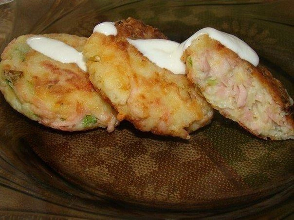 Ингредиенты: - 4 шт вареного картофеля - 100 г твердого сыра - 150 г ветчины - лук зеленый - соль (если нужно) - перец - 2 яйца - 1 столовая ложка муки Приготовление: Картофель, сыр и колбасу натереть на терке. Добавить яйца, лук зеленый, поперчить и если нужно посолить. Добавить муку и все хорошо перемешать. Обвалять в муке, сделать в виде биточков и пожарить их на сковороде. Подаем, полив сметаной. Приятного аппетита!❤️❤️❤️