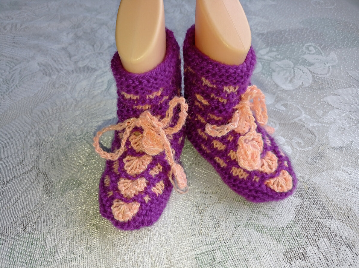 Вяжутся такие башмачки на двух спицах без швов. Для работы потребуется пряжа двух цветов( основного и дополнительного) в моём случае сирень и персиковый, спицы #3 и крючок #3. На спицы набрать основным(сирень) цветом 25 петель и вязать платочной вязкой(все ряды лицевые петли) 6 рядов. Далее присоединить дополнительную(персик) нить и вязать узор таким образом: 1 ряд: 1кром,* 3 лиц, 1 п снять не провязывая, нить при этом идёт за работой*3лиц, кром. 2 ряд: Кром:3 изн, *1 п снять не провязывая, нить при этом идёт перед работой*, 3 изн, кром. 3 и 4 ряд вяжем основным (сирень)цветом всё петли лицевые. 5 ряд. Кром,1 лиц, 1 п снять не провязывая, нить за работой*3 лиц, 1 п снять не проваязывая, нить за работой*1 лиц, кром. 6 ряд. Кром, 1 изн, 1 п снять, нить перед работой*3 изнан, 1 п снять, нить перед работой, *1 изн, кром. 7 и 8 ряды вяжем основным цветом всё петли лицевые. Теперь вяжем 1 ряд дырочек для шнурка, провязывая таким образом:кром,* 1 лиц, накид, 2 вместе лиц, *кром. 1