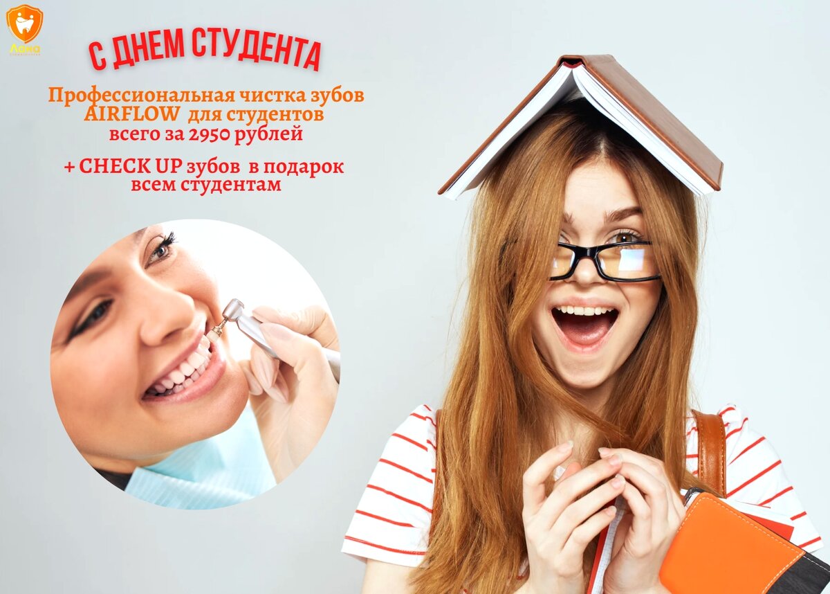 Проведи зимние каникулы с пользой. Профессиональная чистка зубов AIRFLOW для студентов всего за 2950 рублей + CHECK UP зубов в подарок. Акция действует при предъявлении студенческого билета.