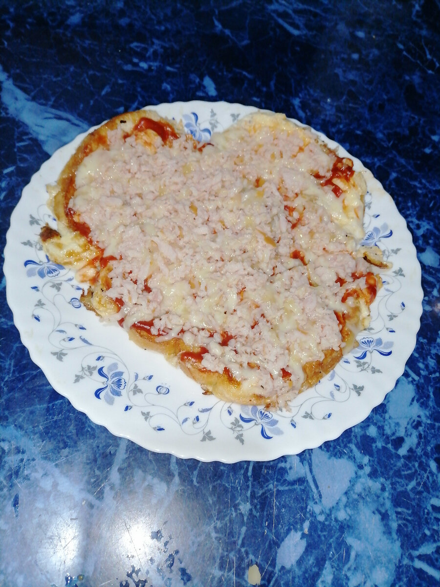 Пицца на сковороде Доброе время суток! Сегодня хочу продолжить тему пиццы. Мой сын очень любит пиццу и один раз мне очень захотелось его удивить. Я покопавшись в интернете нашла рецепт быстрой пиццы. Пицца получается не хуже, чем на тесте. Такая же вкусная и сочная. А ингредиентов минимум. Ингредиенты: Колбаса (любая) – 50 гр. Сыр- 50 гр. Кетчуп – 2 ст. л. Молоко – 100 гр. Яйца- 2 шт. Хлеб белый – 4 кусочка Соль- щепотка Масло растительное для жарки 1) В отдельной емкости взбить яйца с молоком и щепоткой соли. 2) Сыр и колбасу натереть на крупной терке и перемешать. 3) Сковородку хорошо разогреть. 4) Кусочки хлеба обмакнуть в яичной смеси и выложить на сковороду близко друг к другу. 5) Залить хлеб оставшимися яйцами. Дать поджариться и перевернуть. 6) На перевернутый хлеб намазать кетчуп и выложить начинку. 7) Закрыть крышку и дать расплавиться сыру. Примерно 5-7 минут. 8) Готовую пиццу выложить на красивую тарелку. Начинка для данной пиццы может быть различной. Это пицца прекрасна к
