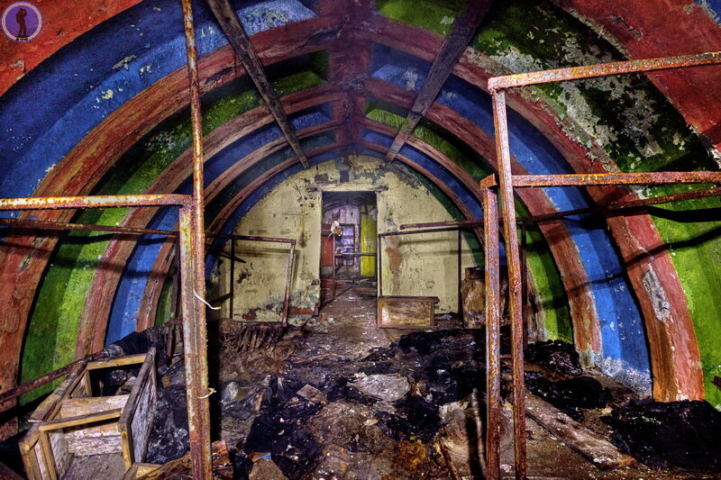 Сегодня мы расскажем про одно из двух заброшенных подземных арочных сооружений бывшего комплекса небольших убежищ, располагавшихся в леске на окраине судоремонтного завода. В этом убежище располагались склады имущества и противогазов, а в случае Чрезвычайных Ситуаций это небольшое подземелье должны были занять рабочие близлежащего цеха и пункт управления. Аналогично первому это сооружение построено из быстровозводимых железобетонных арочных конструкций, обвалованных землёй. Оно представляет собой два подземных блока, соединённых потерной. Так выглядит неприметный заросший вход в это сооружение. Один блок убежища представлял собой зал для укрываемых, который в мирное время использовался как склад различного автомобильного барахла. Внутри всё ещё валялись пара дверей и немного других деталей от автомобилей. У входа в блок на полу был небольшой фундамент, который вероятно использовался для размещения печи-буржуйки или переносного бензогенератора, а может и для чего-то другого. В потерне,