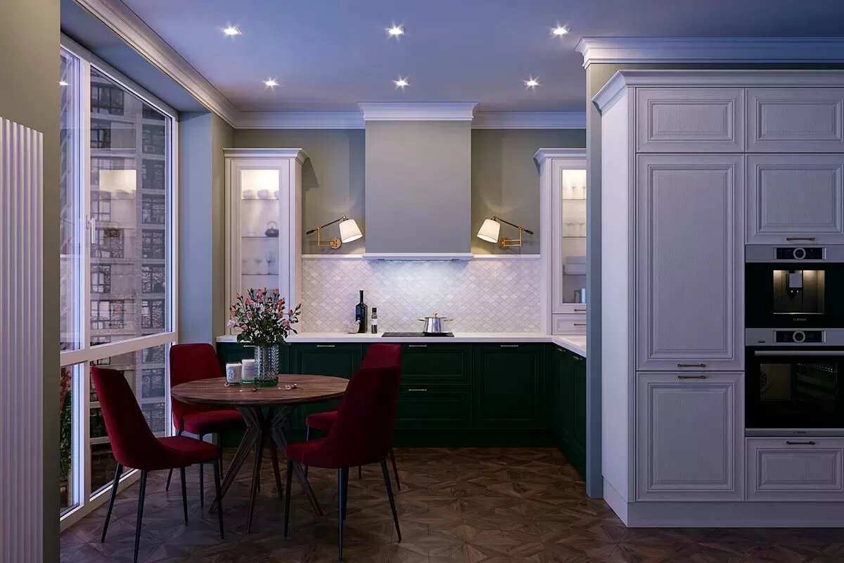 Классический стиль всегда актуален. Элегантность гарнитуров подчеркивают строгие симметричные пропорции и четкие линии. Современный дизайн классической угловой кухни подразумевает использование элементов из других стилей. Например, отделку гарнитура из массива можно дополнить материалами с грубой фактурой — кирпичом, необработанным деревом или металлом. Можно выбрать двухцветные фасады либо поэкспериментировать с сочетаниями оливковых оттенков — такие решения сегодня в тренде.
